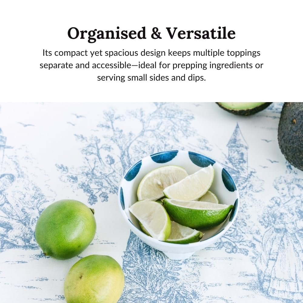 - Ideal for preparing and serving taco toppings, keeping ingredients organized and accessible.