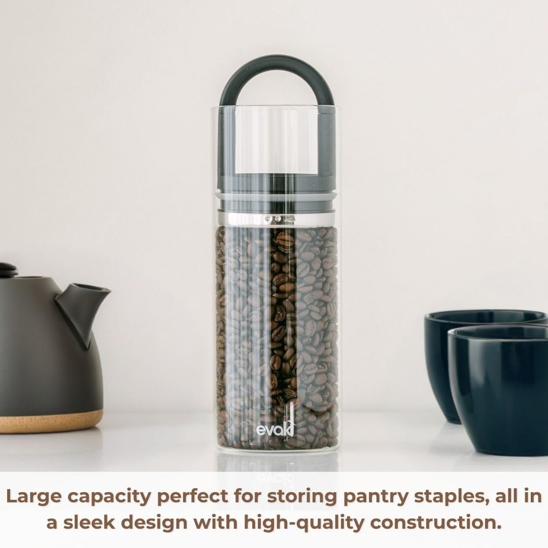 - GREAT LOOKING PRODUCT. Crystal clear and solidly built, the Evak stores conveniently and looks great on any counter or pantry, a beautiful complement to most kitchen décor. The Evak has now won 4 Internationally recognized awards for its cosmetic design and its practical functionality.